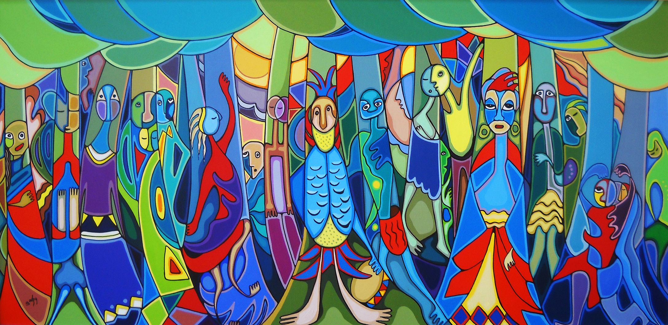 Harmony and the Universe (seen above) expresses the importance and beauty of trees and forests. Daphne always used to say that trees could talk – she meant that they had their own spiritual voice, and deserved respect as living beings. In this joyful painting, we see that thought exemplified in the spirits and dancers celebrating among the trees. It’s such a hopeful image for troubled times.