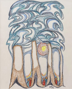During their long sketching sessions, Jonas would tell Daphne traditional stories: the tales of creation, the legends of Nanabush. These themes would feature heavily in many of her most celebrated canvases but throughout her five decades of art-making, Daphne never stopped drawing. From the time she was a young girl up until her final days surrounded by the forests of Kelowna, British Columbia, Daphne continued to feed her love of drawing. Over the course of her illustrious career, she received five honorary doctorates, was awarded her country’s highest medal of achievement, the Order of Canada and was one of only a handful of artists to see her work featured on Canadian, US, and International postage stamps.