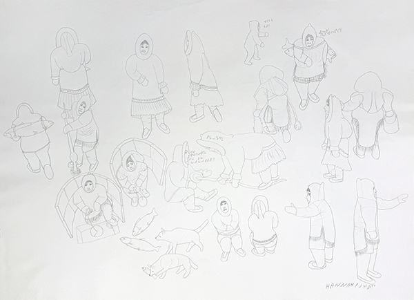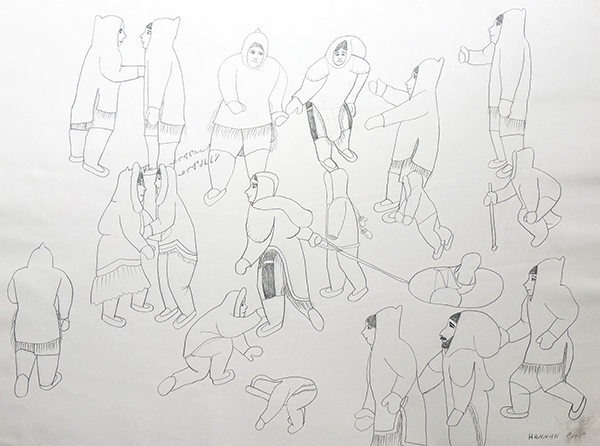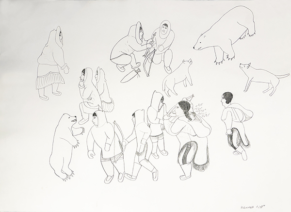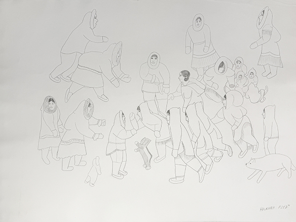 Kigusiuq draws inspiration for her art from her experience living on the land as a young woman, and she typically depicts communal activities from traditional Inuit lifestyle. Winter camp scenes, groups traveling on the land by foot or dogteam, and Inuit celebrating traditional drum dances are among her favored subjects, though Kigusiuq occasionally illustrates episodes from traditional Inuit mythology and from the Christian Bible as well. She is best known for her carefully controlled graphite pencil line drawings in which she situates large numbers of people and animals in complex relationships with one another frequently adding Inuktitut syllabic notations to clarify her intent or to present conversation among individuals. She rarely incoporates color, preferring instead the clarity of carefully-drawn line.”