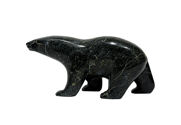 The stone Johnny uses, called serpentine, is unique to Baffin Island. It is a very hard stone, varying in colour from light green to brown and black, often with golden veining in it. Johhny's sculpture is usually highly polished to best exhibit the beauty of the stone.