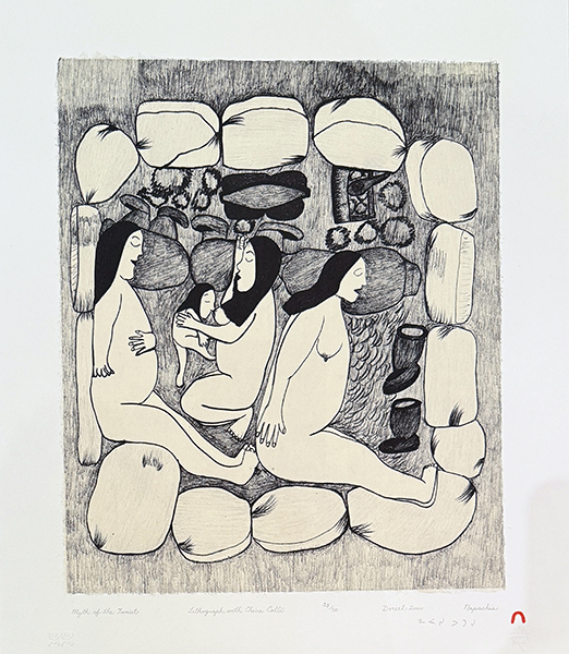 Although much of her early work, such as the print, “Eskimo Sea Dreams” (1960), presents a lyrical, dream-like reflection of Inuit beliefs in the spirit world, the main thrust of her prints and drawings since the mid-1970’s have been more concerned with recording traditional life, clothing and local Inuit history. In prints such as, “Atchealda’s Battle” (1978), “The First Policeman I Saw” (1978), “Nascopie Reef” (1989) and “Whaler’s Exchange” (1989), Napatchie uses a vigorous, energetic figurative style to bring to life significant events of the past. Like her sister-in-law, Sorosiluto, Napatchie participated in the acrylic painting/drawing workshops established by the West Baffin Co-operative in 1976. Her interest in landscape and Western notions of spatial composition would seem to grow out of this experience. Most recently, Napatchie has been working directly in the lithographic medium and experimenting with life drawing as a preparatory stage toward the print image.” - Marie Routledge, “North American Women Artists of the Twentieth Century: A Biographical Dictionary”, 1995