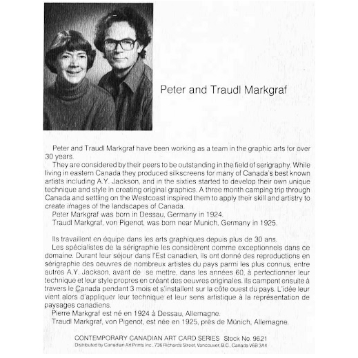 Silkscreen artists Peter, and Traudl Markgraf participated in several reproduction programs to promote Canadian art after they immigrated to Canada from Germany in the mid-1950s. The Markgrafs developed a silkscreen process noted for its printing quality and its faithfulness to the original painting. The National Gallery of Canada became involved with the Markgrafs in the mid-1950s when Montreal collector and philanthropist Sidney Dawes introduced then Gallery director Alan Jarvis to the work of the Markgrafs.