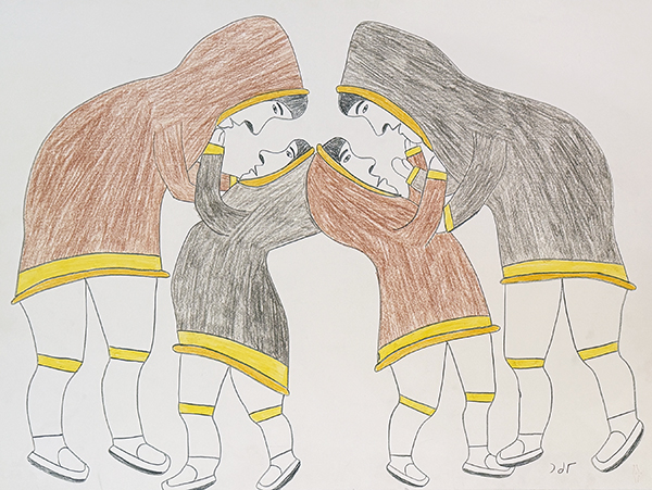 Tookoome began by carving bone and soapstone in the 1960s but was more interested in drawing as it gave him greater artistic freedom. Tookoome’s graphic style is influenced greatly by his childhood, being raised on the land and hearing traditional stories from his family. Drawing ideas from the land around him Tookoome’s aesthetic engages with hybrid animals and shamanic practices, influenced by heavy contour lines and deep, saturated tones of colour. Utilizing a flat plane, Tookoome’s drawings have a graphic quality as well as a clear narrative. Sometimes depicting two dancers and a drum, his figures are often in profile, animated movements portrayed through the curves of contour lines. Objects radiate light through a saturated use of colour, linked to the decoration of clothing that adorn the figures. Community is depicted in the radiating heads of people and dogs, that are positioned like rays moving outwards, and at once encompassing the two figures.