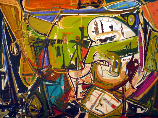 oil & mixed media collage on board, 33.25″ x 43.75″